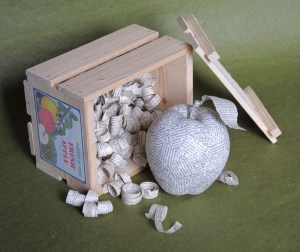 Dictionary pages (‘excelsior’ packing includes part of ‘A’ page listing historical apple varieties), styrofoam, coated wire, recycled spruce lumber, brass tacks, 100% cotton rag paper, inkjet printing, PVA/starch paste mix. Crate constructed by David G. Miller, designed by Cathryn Miller.