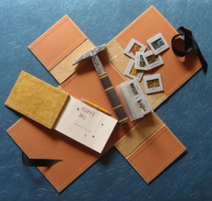 One copy of The Earth (Life Nature Library 1962), Indian and Canson Mi-Teintes papers, book board, wood, Sculpey, plastic slide box and mounts, pencil grosgrain ribbon.
