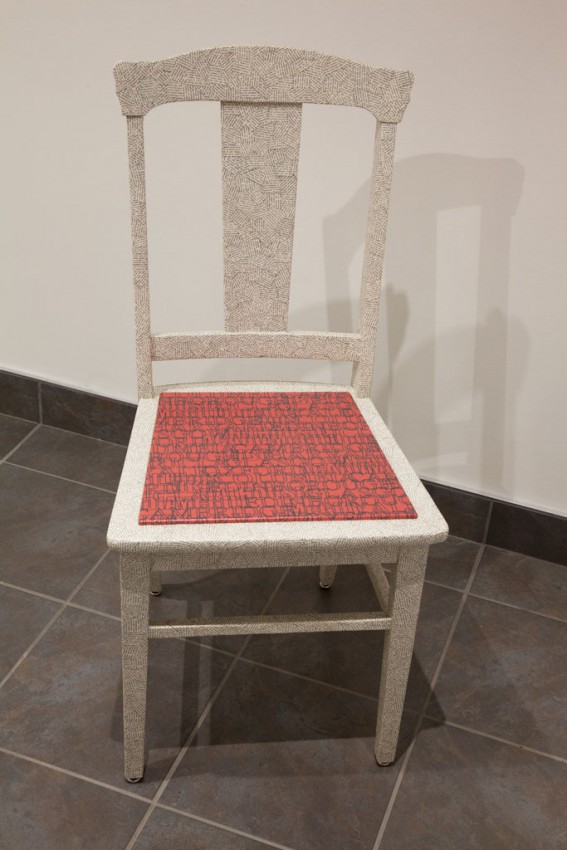 Maple chair; pages from Volume 1, Universal Standard Encyclopedia, Deluxe Edition; fir plywood; archival inkjet print on Arches text, polyacrylic varnish.